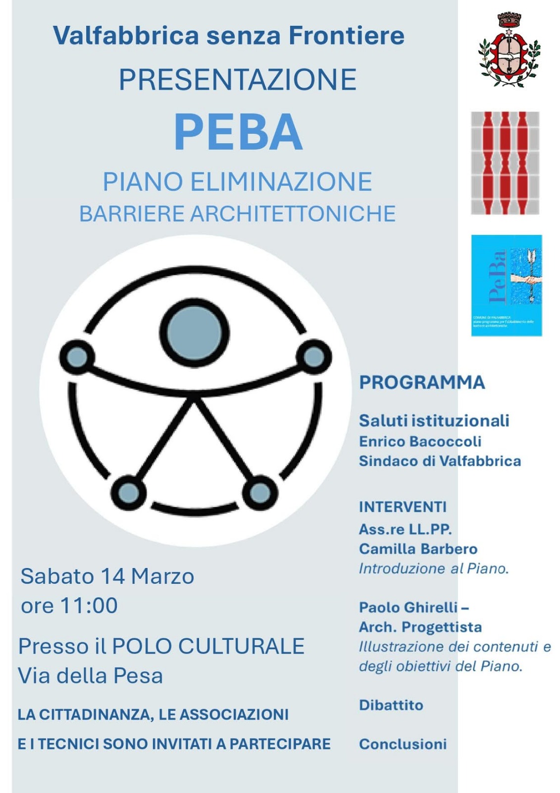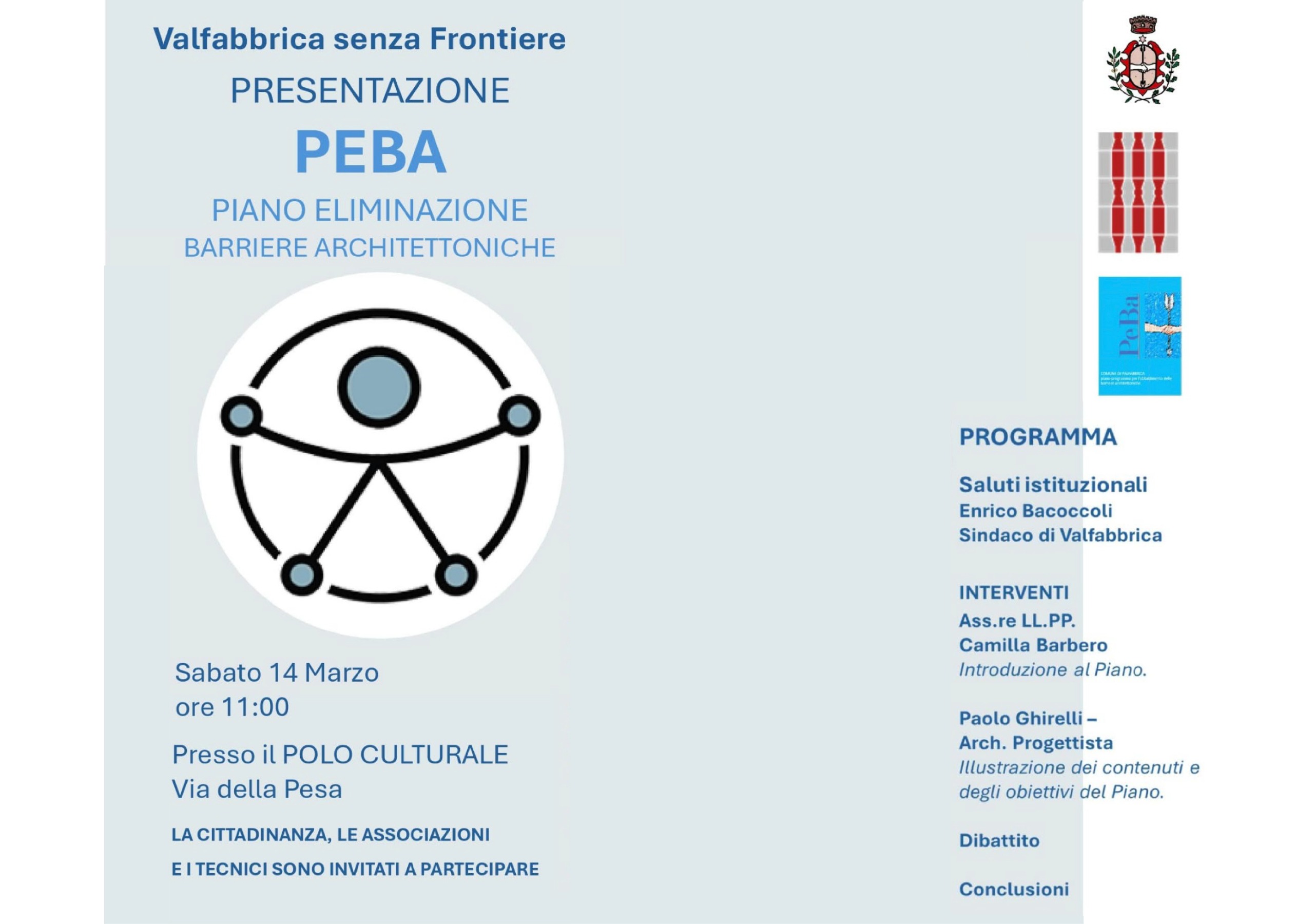 Sabato 14 marzo alle ore 11:00, presso il Polo Culturale di Via della Pesa, si terrà la presentazione del PEBA – Piano per l’Eliminazione delle Barriere Architettoniche del Comune di Valfabbrica. Tra gli interventi, l’arch. Paolo Ghirelli di Cooprogetti, che illustrerà contenuti e obiettivi del Piano, uno strumento fondamentale per rendere gli spazi pubblici sempre più accessibili e inclusivi. Un momento di confronto aperto con cittadini, associazioni e tecnici del territorio.